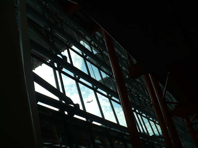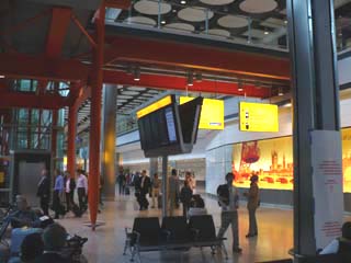 | ヒースロー空港に着きました。上の窓の所を次々と飛行機が飛び立ちます。世界中の飛行機が1日約1250便発着するのだそうです。⇒写真を拡大する | ヒースロー空港の中の様子です。 | |