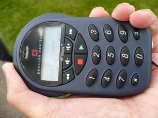 | 各自1台ずつガイドレシーバーが配られました。あちこちに番号表示があり、その番号を押すと日本語で説明が聞けます。 | 通路から出ると、広大な草原の中にストーンヘンジの全景が眼に入ってきます。 ⇒写真を拡大する | |