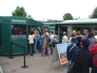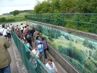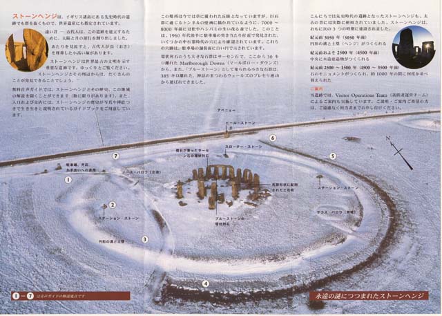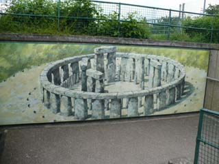| 入場券売り場です。結構人が並んでいました。日本語のパンフレットが用意されていました。⇒パンフレット表紙 ⇒パンフレット内容 | 道路の下に作られた通路を通って入場します。通路の両側に、ストーンヘンジ創造時の想像画?が描かれています。 | |