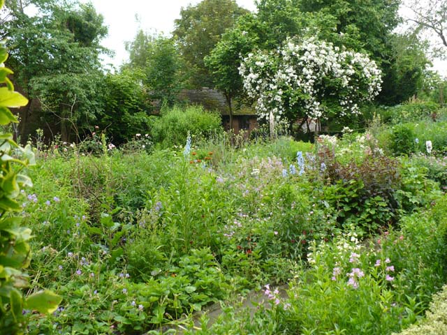 塀の外から庭を覗いてみました。シェイクスピアの時代の庭園を模して造られているそうですが、なんか雑然としていますね。⇒