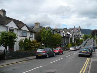 街から少し離れたところです。住宅街なんでしょうか、両側にずらりと車が止められています。⇒