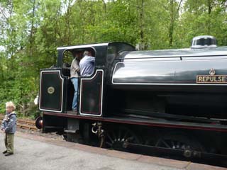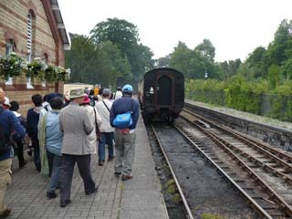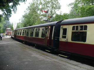 | ウィンダミア湖南端にあるレイクサイド駅から、ハーバースウェイト駅までレヴァン渓谷の眺めを楽しむ保存鉄道です。船が遅れたので、急いで乗車しないといけませんでした。⇒写真を拡大する | 列車の方に行っても機関車の姿が見えません。このずっと先にあるようです。 | |
