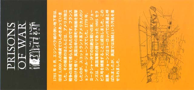 | 捕虜収容所を見学しました。入口で日本語のパンフレットを貰いました。⇒写真を拡大する | 暗い中へ入っていきます。アメリカ独立戦争の開戦で捕らえられた捕虜が収容されていたとのことです。 | |