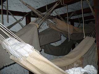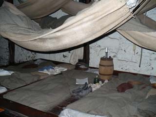 | ハンモックがあちこちに吊るされています。こんな狭い所に随分大勢の人が収容されていたのですね。 | ハンモックの下にはベッドも誂えられています。 1781年にはここに1,000人もの捕虜が収容されていたそうです。 | |