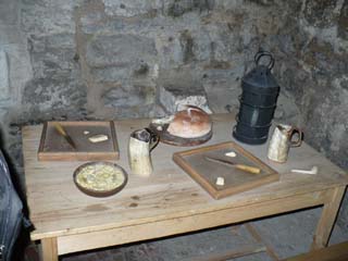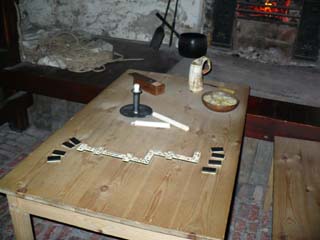 | ここには暖炉があり、何やらゲームも行われていたようです。 | ここは食事をするところでしょうか。パンとかチーズのようなものがありました。 | |