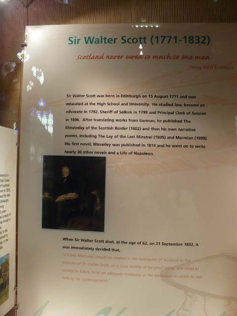 | ここで入場料を払います。ガイドさんに聞いたら以前ここは1ポンドで入れたとのこと、今は・・・なんと3ポンドに値上がりしていました。 | 中にウォルタースコットに関する資料の展示がありました。写真を拡大する | |