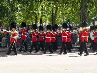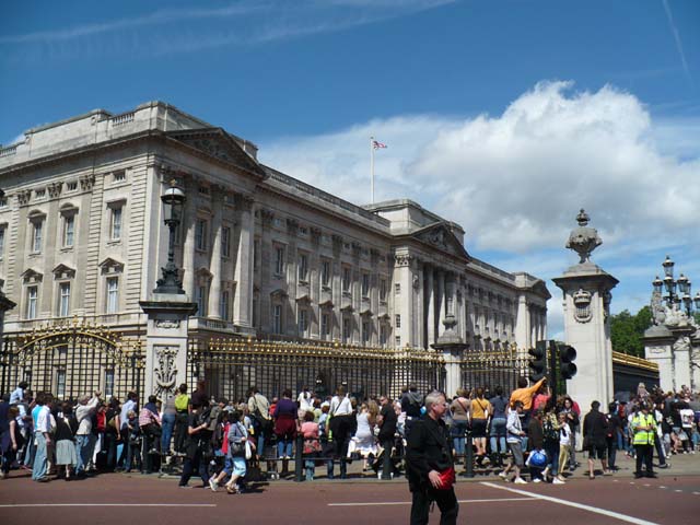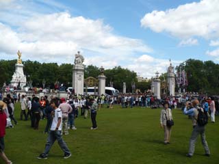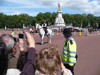 | バッキンガム宮殿に着きますと、もう既に大勢の人が集まっていました。ガイドさんの指示で割合いいところで衛兵交代が見学できました。⇒写真を拡大する | ガイドさんからまずはこの辺りということで、最初の位置を確保しました。皆さん道の中ばまで入っていたのですが、騎馬警官に後退させられてしまいました。⇒映像を見る ⇒縮小映像 | |