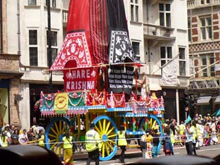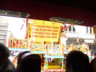 | バッキンガム宮殿を後に、昼食に向かう途中で見ました。ハーレ・クリシュナのお祭りのようです。⇒写真を拡大する | クリシュナは、インド神話に登場する英雄です。この神を崇拝する人々は皆ベジタリアンなんだそうです。 | |