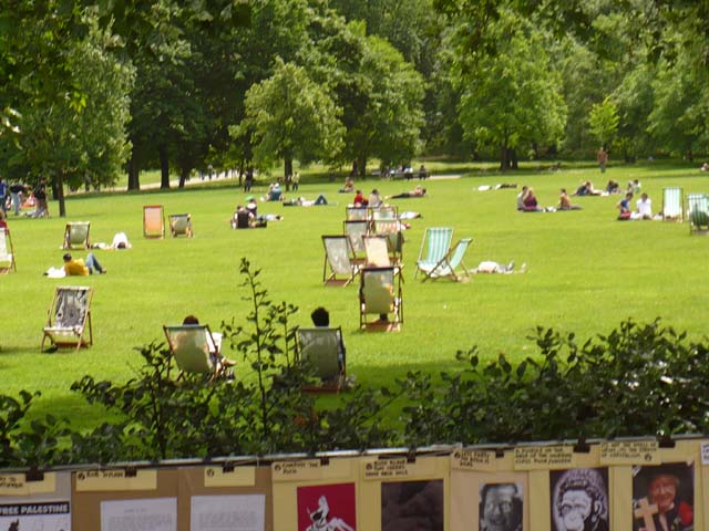 公園の芝生の上で、皆さんのんびり昼寝です。でも空いてるデッキチェアを使ったりすると、しっかり料金を取られるそうです。⇒写真を拡大する |