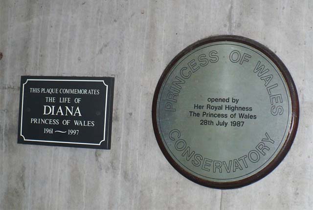 プリンセス・オブ・ウェールズ・コンサーバトリーはオーガスタ皇太子妃を記念して建てられたガラスハウスで、ダイアナ妃によってオープンされました。⇒表示板を拡大する |