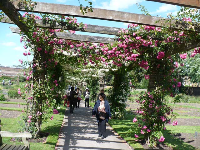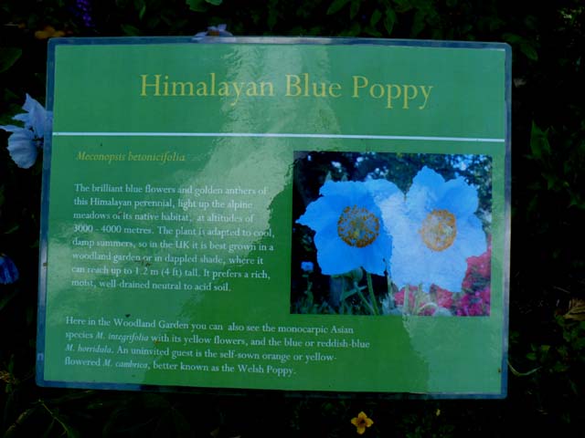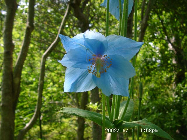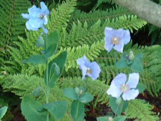 | バラの棚の下を潜って進みました。⇒写真を拡大する | バラの棚の先に、ヒマラヤの青いケシがありました。望遠で撮ったらピンボケになりました。⇒説明を読む 参考:日本にもあちこちにあります。以前箱根の湿性花園で写した写真です。⇒その写真 | |