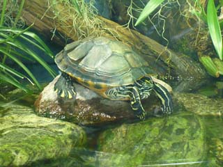 この亀は、日本で捨てられ増えて困っている外来種の亀と、同じ種類ではないですかね?⇒写真を拡大する |