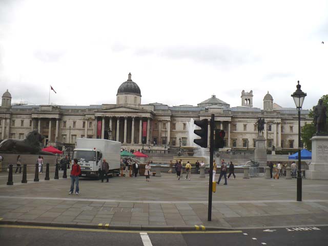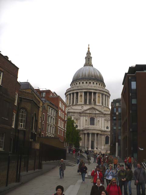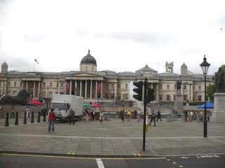 | 朝のトラファルガースクエアの様子です。まだ人出は多くありません。正面がこの後2度訪れることになった、ナショナルギャラリーです。⇒写真を拡大する | セントポール寺院はロンドンの中心:シティにほど近い場所にあります。⇒写真を拡大する | |