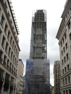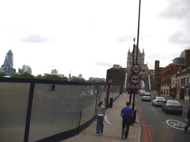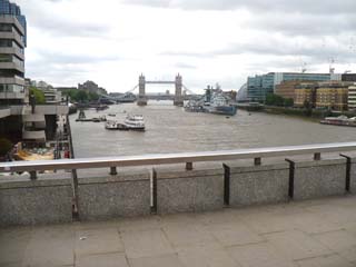 | ロンドン大火記念塔は修復中でした。 1666年、ロンドンの大火災の記念碑で、セントポール寺院もまた、高い塔を残して完全に崩れ去ったそうです。⇒写真を拡大する | ロンドンブリッジからタワー・ブリッジを見ています。タワー・ブリッジは塔の上に上がることもでき、ロンドンの眺めも楽しむことができるようです。現在では橋が跳ね上がることは少なくなったそうです。 ⇒写真を拡大する | |