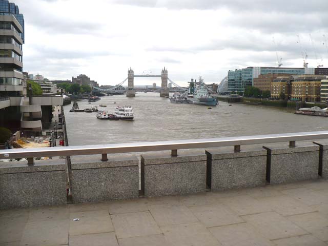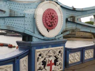 | タワーブリッジの橋桁にはイングランド国旗(St.George旗)が描かれていました。 | 今度はタワーブリッジからロンドンブリッジを見たところです。「ロンドン橋落ちた ♪」の歌で有名ですが、形は普通ですね。⇒写真を拡大する | |