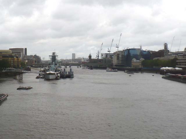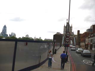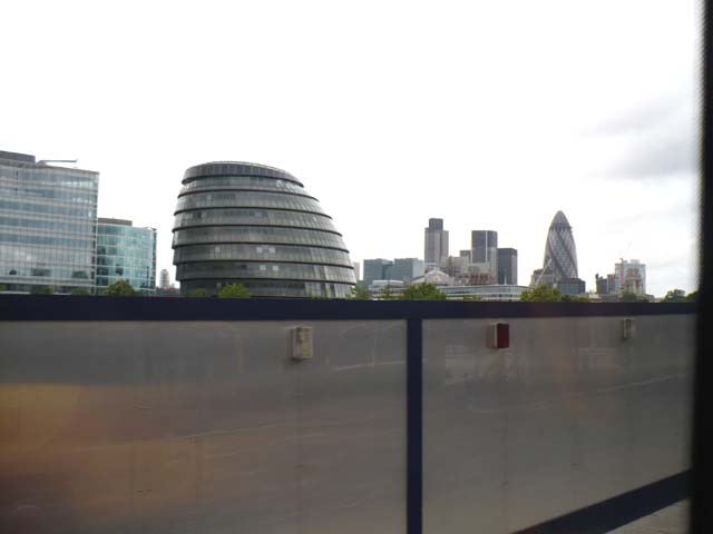 今度はタワーブリッジを渡ります。左手に見える砲弾型の建物は30セント・メリー・アクス(通称ガーキン:キュウリの意)です。⇒写真を拡大する |