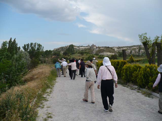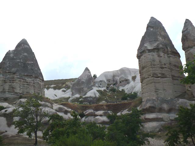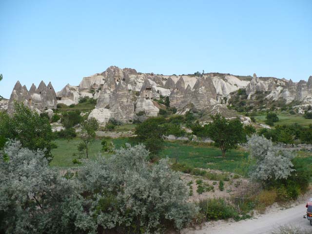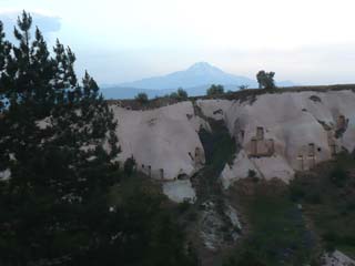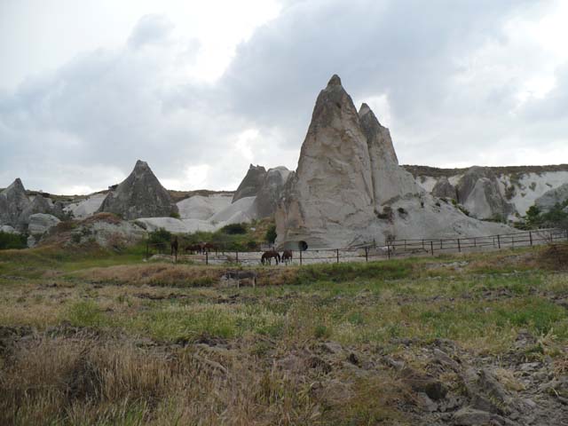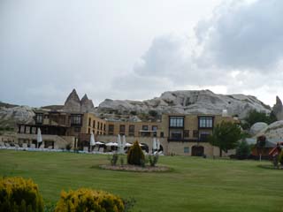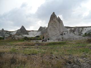 | 綺麗なホテルがありました。「今晩ここへ泊まるのかなぁ」なんて一瞬思いましたが、全然違っていました。 ⇒写真を拡大する | カッパドキアとは「美しき馬の地」という意味だそうです。ここにも馬が飼われています。⇒写真を拡大する | |