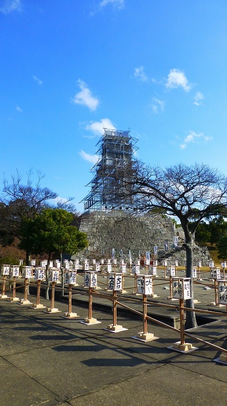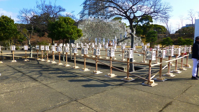 | 天守台の前には義士の名前等を書いた行灯が並んでいます。⇒写真を拡大する | 奥に見えるのが天守台です。義士祭にはイルミネーションで天守閣が再現されるようです。見たかったなぁ!⇒写真を拡大する | |
