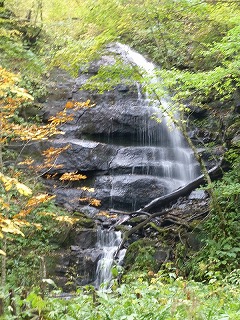| 九段の滝です。落差15m、段々状の岩を滑り落ちるように流れている美しい滝です。⇒写真を拡大する | 形が特徴的ですので、判り易いですね。⇒写真を拡大する | |