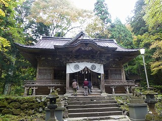 | 神社が見えてきました。祭紳は「日本武尊」で、かなりのパワースポットとか・・⇒写真を拡大する | 十和田神社本殿です。お参りをして、集合場所へ向かいました。⇒写真を拡大する | |